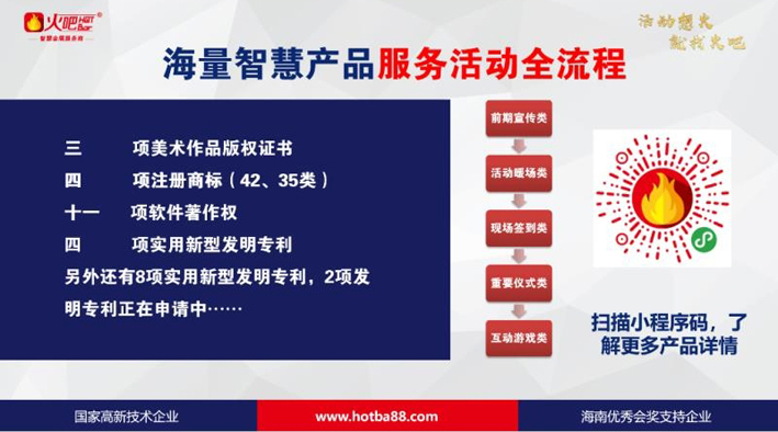 海南省誠信企業(yè)協(xié)會會員海南火吧時代科技有限公司專注于會議會展技術(shù)服務(wù),始終堅守“讓活動更高效、讓現(xiàn)場更火爆”的創(chuàng)業(yè)初心,搭建了我國首個會展科技成果轉(zhuǎn)化平臺——火吧,現(xiàn)已成功掛牌海南省股權(quán)交易中心,企業(yè)代碼為90963。