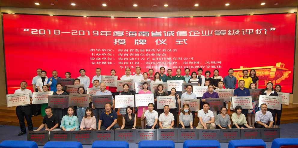 7月22日,由海南省發(fā)改委等政府部門指導(dǎo),海南省誠信企業(yè)協(xié)會主辦、海南誠行天下文化傳媒有限公司協(xié)辦的“2018-2019年度海南省誠信企業(yè)等級評價”授牌儀式在海口市民游客中心隆重舉行。