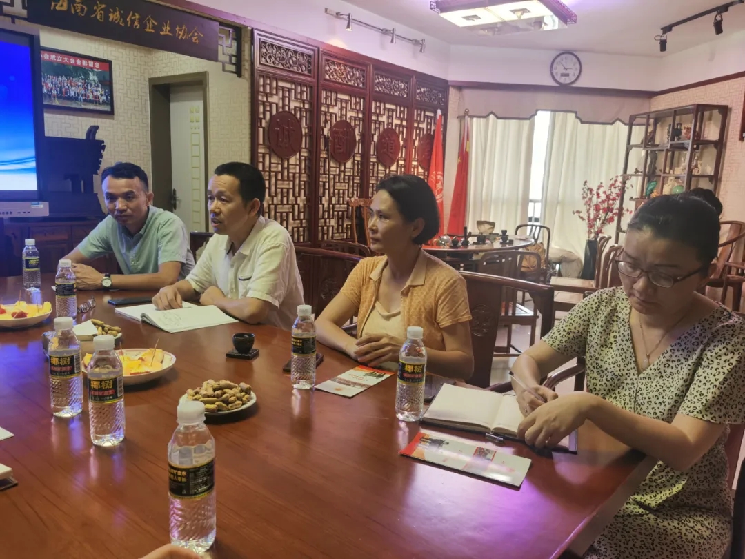誠協顧問海南政信金服信息服務有限公司董事長黃穎、副會長海南國樹沉香文化產業管理有限公司熊嫦君老總到訪誠協秘書處,為協會發展獻計獻策,并與孫秀山會長、傅姝暢秘書長探討協會工作規劃。