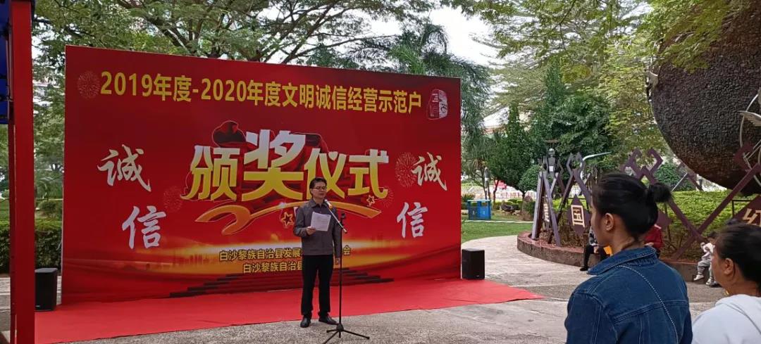為加快推進信用白沙建設,大力加強文明白沙建設,推動白沙商務誠信建設,帶動各商戶、群眾深入開展文明誠信創建活動。11月25日上午,縣發改委、縣委宣傳部、縣商務局、縣金融中心聯合開展了“文明誠信經營示范戶”表彰儀式暨《海南自由貿易港社會信用條例》宣傳活動。