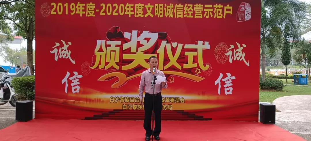 表彰議程分為四項,先是由商務局局長劉海鉑宣讀《白沙黎族自治縣商務局關于表彰2019-2020年度白沙縣“文明誠信經營示范戶”決定》表彰決定,而后由縣發改委副主任宣基給受表彰商戶頒獎,接著由商戶代表海南農墾白沙茶業股份有限公司負責人徐亮發言,最后由宣基做總結發言。宣基強調,開展文明誠信經營戶評選的目的,是為了倡導誠信經營、依法經營、文明經營;是為了樹立誠信意識、守法意識、文明意識;是為了維護社會信用、商戶信用、群眾信用。