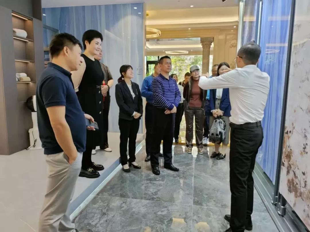 呂翹羽總經理攜公司管理團隊熱情接待省誠協領導及會員一行,呂總經理帶領大家參觀了公司及石材展廳,介紹了公司的發展歷程、誠信文化、公司榮譽及工程案例,石材展示廳展示了來自世界各地的優質石材及多種裝飾效果,美輪美奐,讓大家大開眼界,對此稱贊連連。中間閩泉山石業員工展示了他們每天的晨會主題內容,驚艷全場,威武的站姿、洪亮整齊的口號,淋漓盡致的展示了閩泉山積極向上的企業文化,大家對所見所感都感到震撼,紛紛表示,以后自己裝修房子或者給朋友推薦石材首選閩泉山石業有限公司。