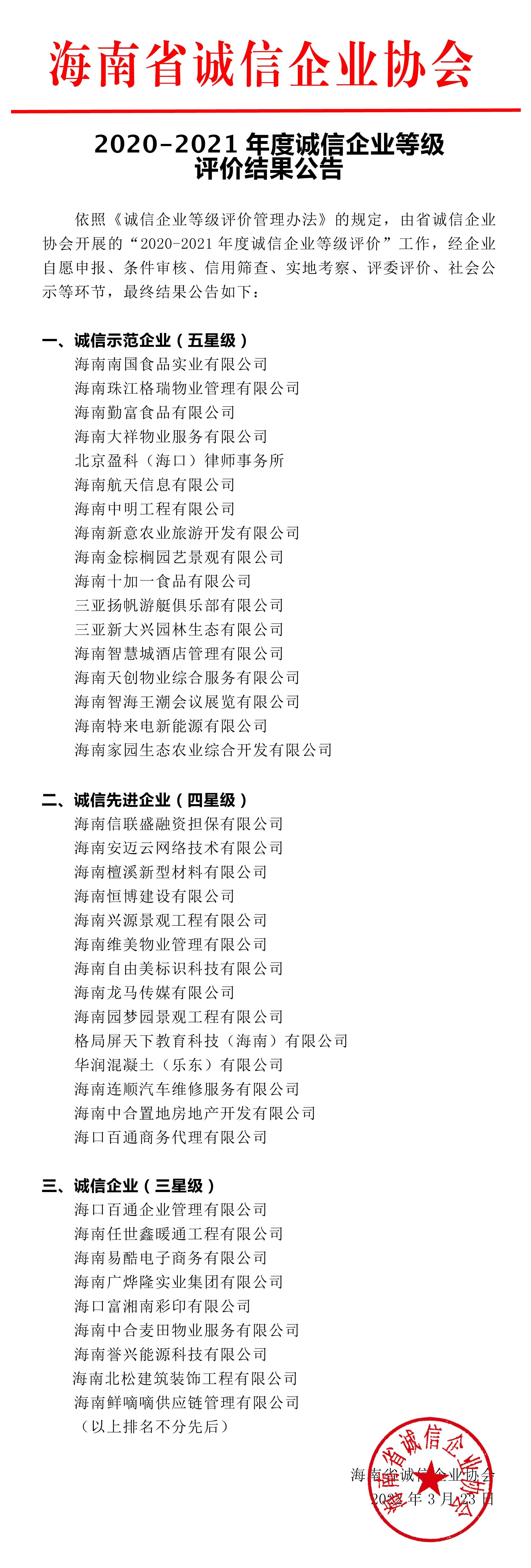 依照《誠信企業等級評價管理辦法》的規定,由省誠信企業協會開展的“2020-2021年度誠信企業等級評價”工作,經企業自愿申報、條件審核、信用篩查、實地考察、評委評價、社會公示等環節,最終結果公告如下: