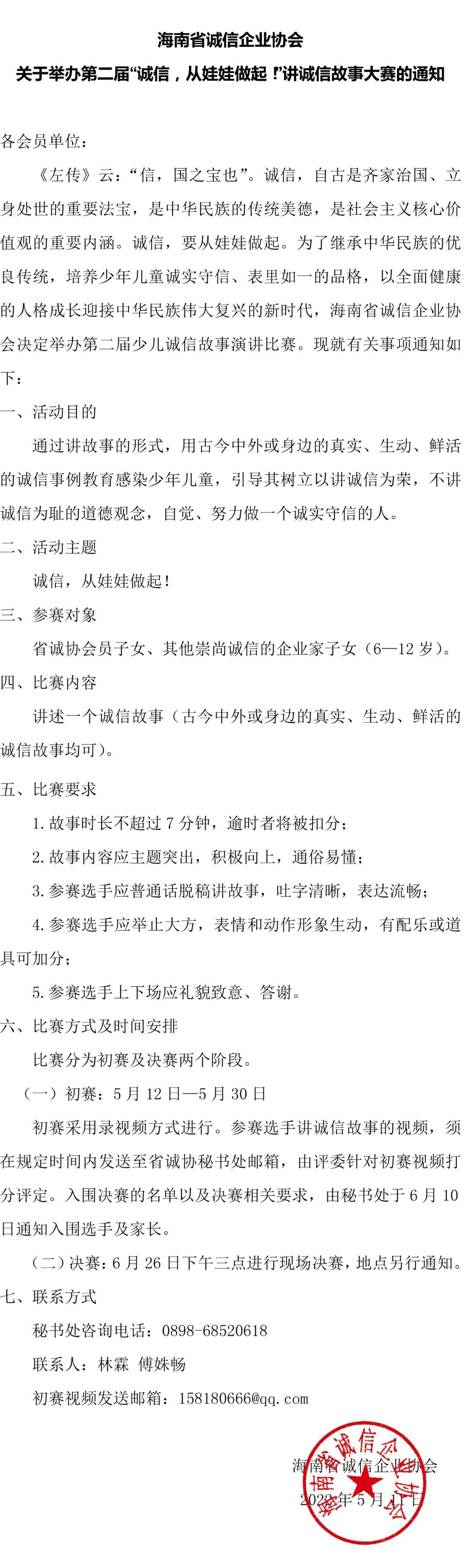 海南省誠信企業協會關于舉辦第二屆“誠信,從娃娃做起!”講誠信故事大賽的通知