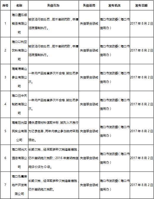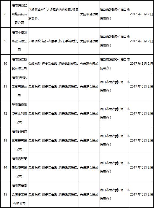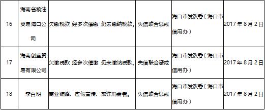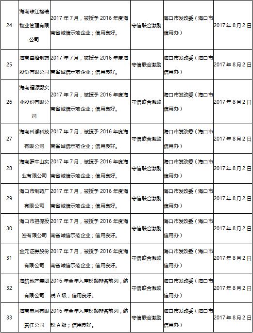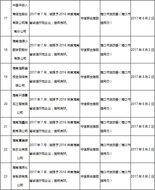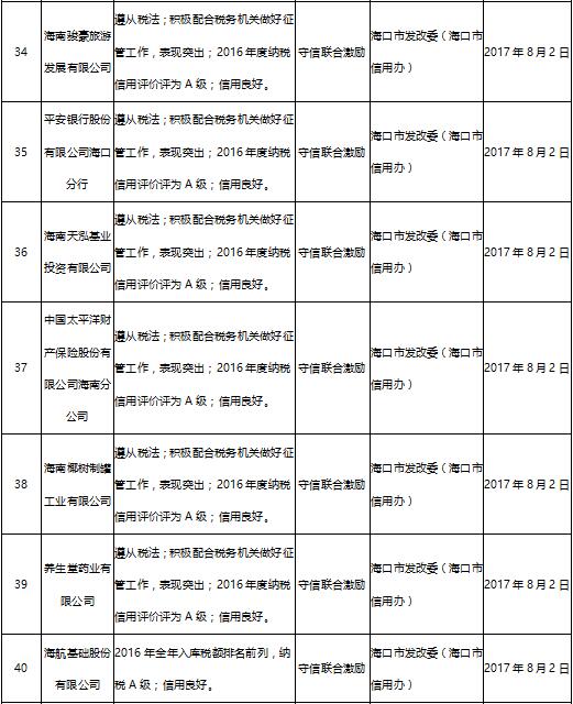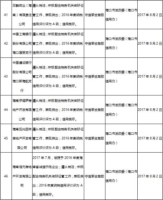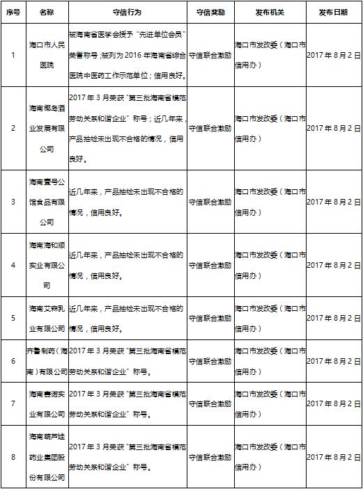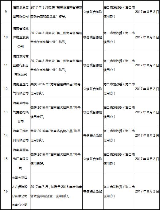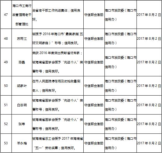 海口市信用“紅黑名單”(第二批) 守信“紅名單”