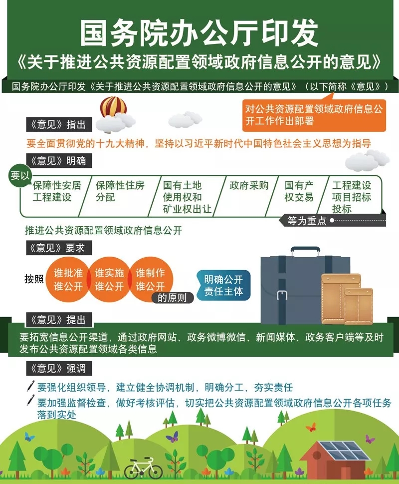日前,國務(wù)院辦公廳印發(fā)《關(guān)于推進(jìn)公共資源配置領(lǐng)域政府信息公開的意見》(以下簡稱《意見》),對公共資源配置領(lǐng)域政府信息公開工作作出部署。